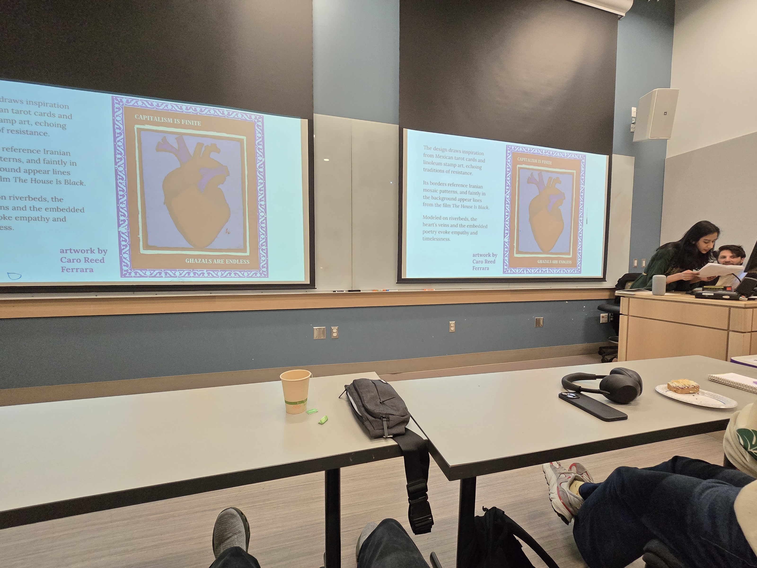 On November 14, 2025 Translation Studies hosted a Ghazal poetry night in Denny 211. The room was so full that some people had to bring chairs from other rooms! The event began with MELC’s Dr. Aria Fani introducing the Translation Studies program and the importance of translations. The attendees enjoyed reading poetry in different original and translated languages: Arabic, Amharic, French, Persian, Russian, Turkish, Urdu, Yiddish, and Korean, to name a few. The poems engaged many themes ranging from passionate love of a lover for their beloved, to a scathing criticism of city life, to addressing cultural prejudices.